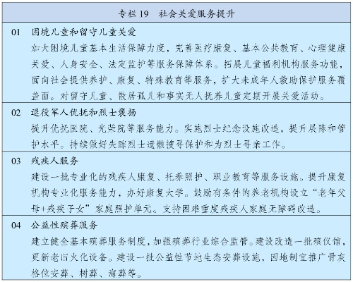 完善残疾人社会保障制度和关爱服务体系,促进残疾人事业全面发展。强化对重度残疾、多重残疾、一户多残等群体兜底保障,健全困难残疾人生活补贴、重度残疾人护理补贴制度及补贴标准动态调整机制,加强残疾儿童康复救助,健全残疾人辅助器具适配补贴制度。完善残疾人社区和家庭支持,加强重度残疾人托养照护,发展精神障碍社区康复。强化残疾人就业帮扶,完善按比例就业、集中就业、自主就业促进机制。发展残疾人文化体育。深入推进科技助残,加强公共设施、信息交流、社会服务无障碍环境建设。